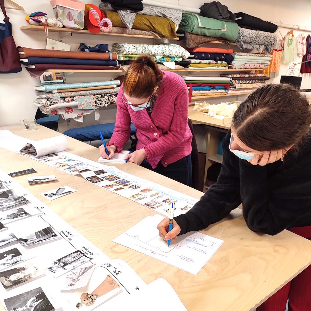 Le matériel et fournitures sont prévus et à disposition selon les cours: règles, ciseaux, aiguilles, crayons-craie, thermocollant, molleton, papier calque, toile à patron... Chaque stagiaire dispose d'un espace sur des tables de coupe à hauteur étudiée pour la couture et le modélisme. Pour les stagiaires en formation professionnelle, un choix de patron et documentation couture est accessible en consultation.