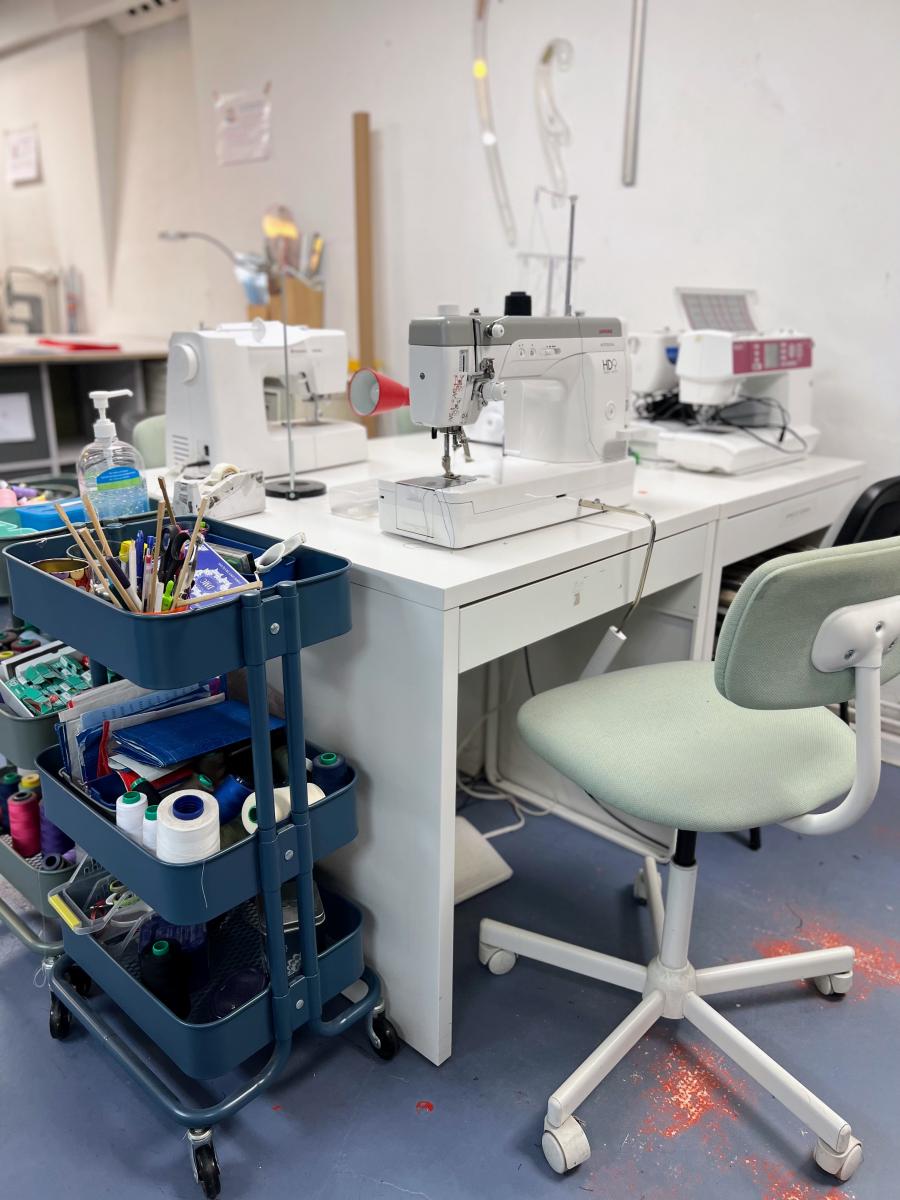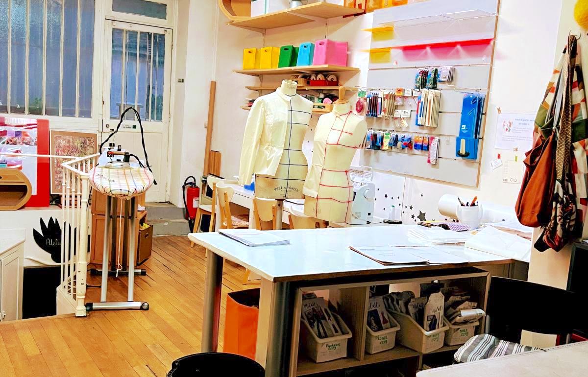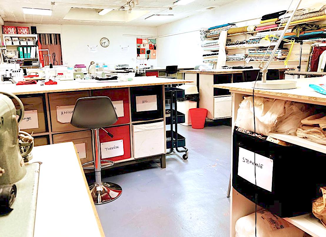 L'atelier dispose de machines pour chaque stagiaires (5 au maximum): machines électroniques, industrielles, semi-industrielle et surjeteuses sont à disposition. Côté repassage, un poste avec centrale vapeur est accessible à chaque atelier.
